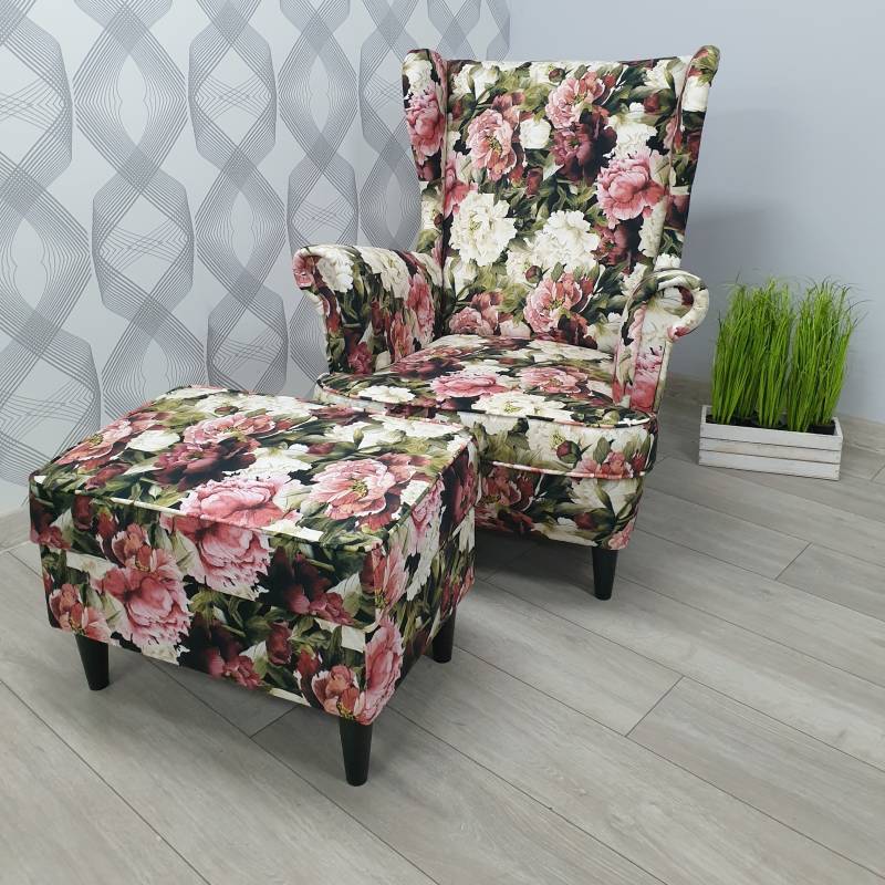 Wprowadź do swojego wnętrza elegancję i funkcjonalność dzięki Fotelowi Uszakowi z podnóżkiem i schowkiem, tapicerowanemu tkaniną w kwiatowy motyw piwonii. Ten zestaw łączy w sobie klasyczny design z praktycznymi rozwiązaniami, idealny do salonu, sypialni czy kącika relaksacyjnego.