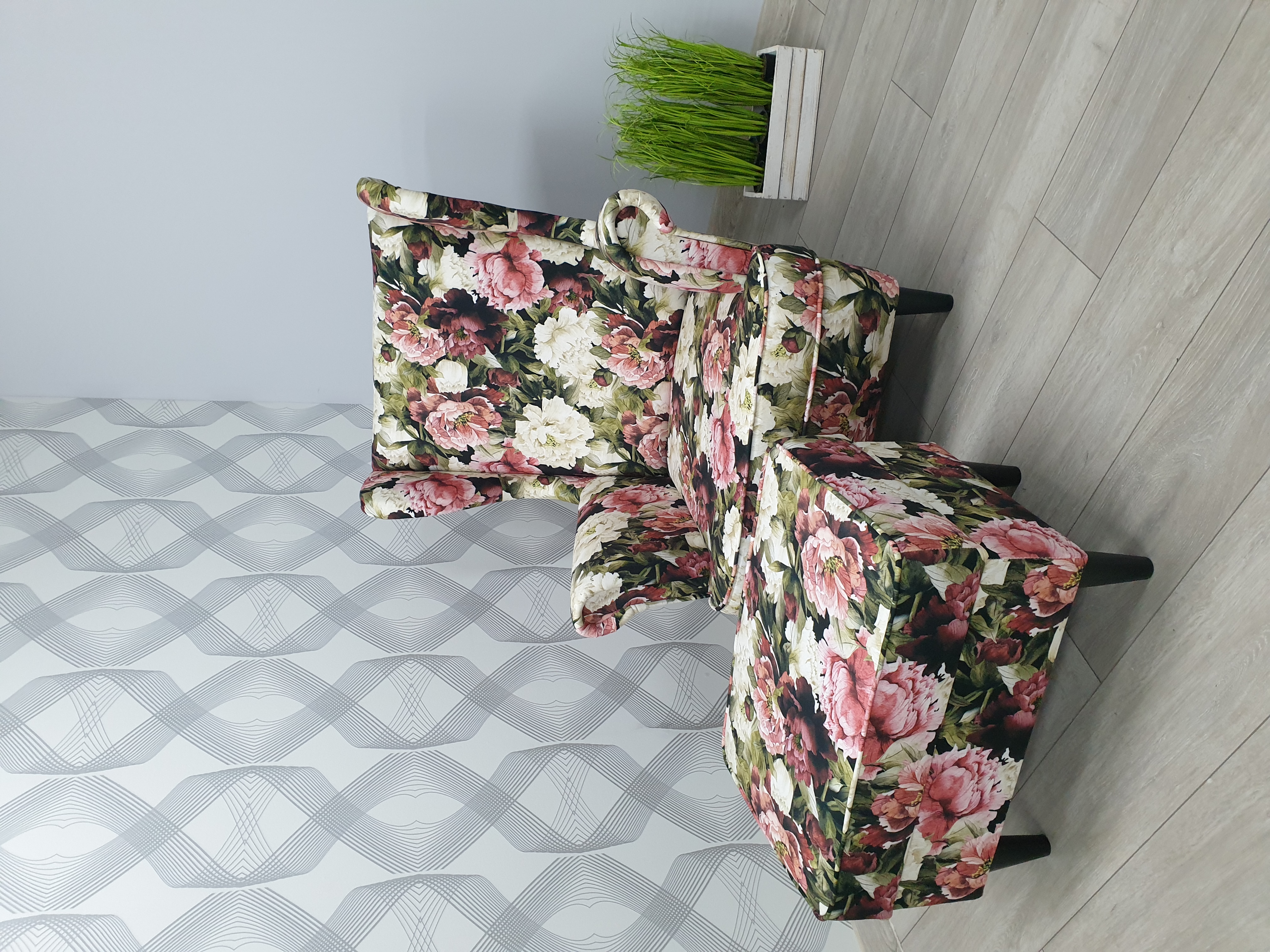 Fotel + Pufa wykonany z tkaniny Piwonie