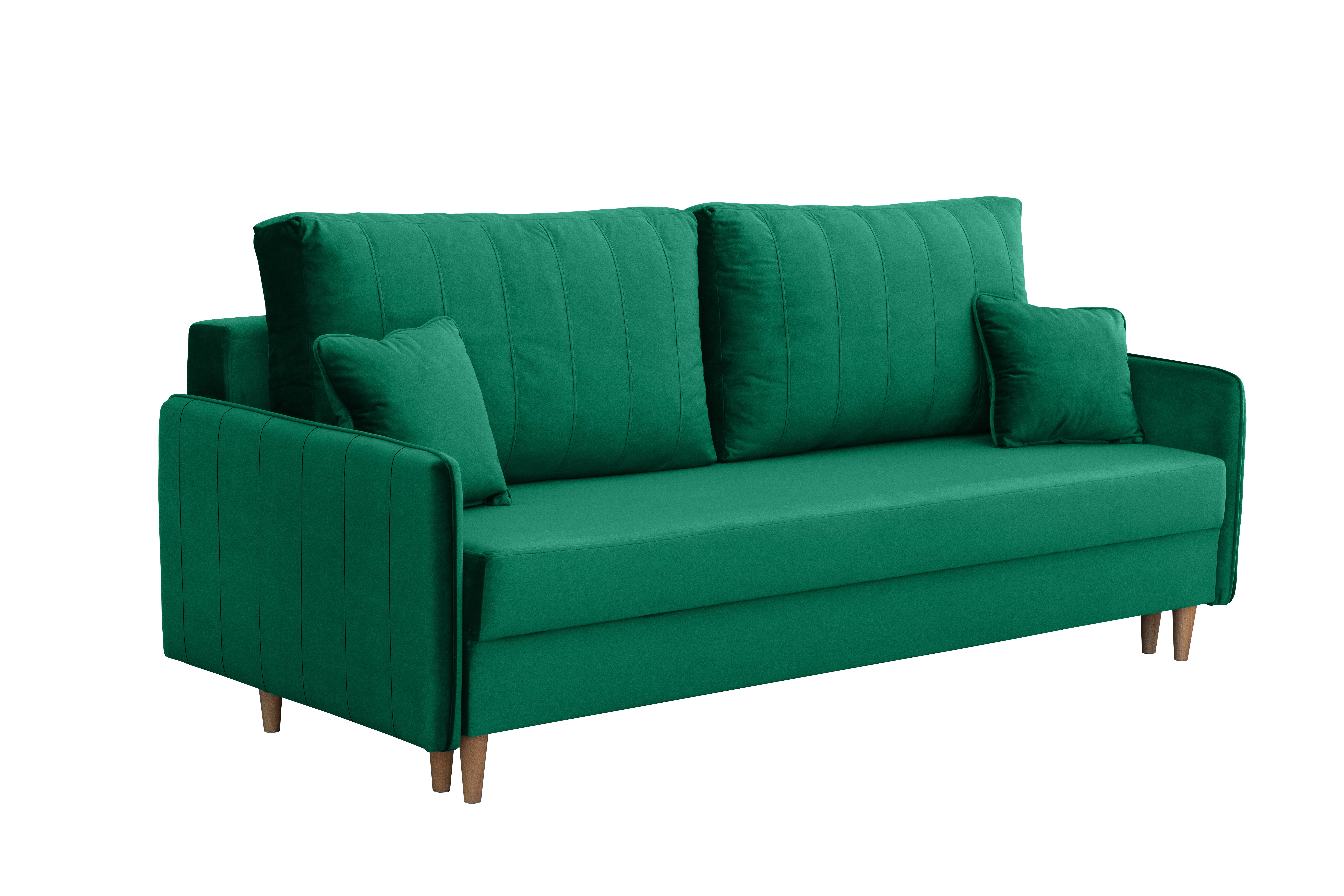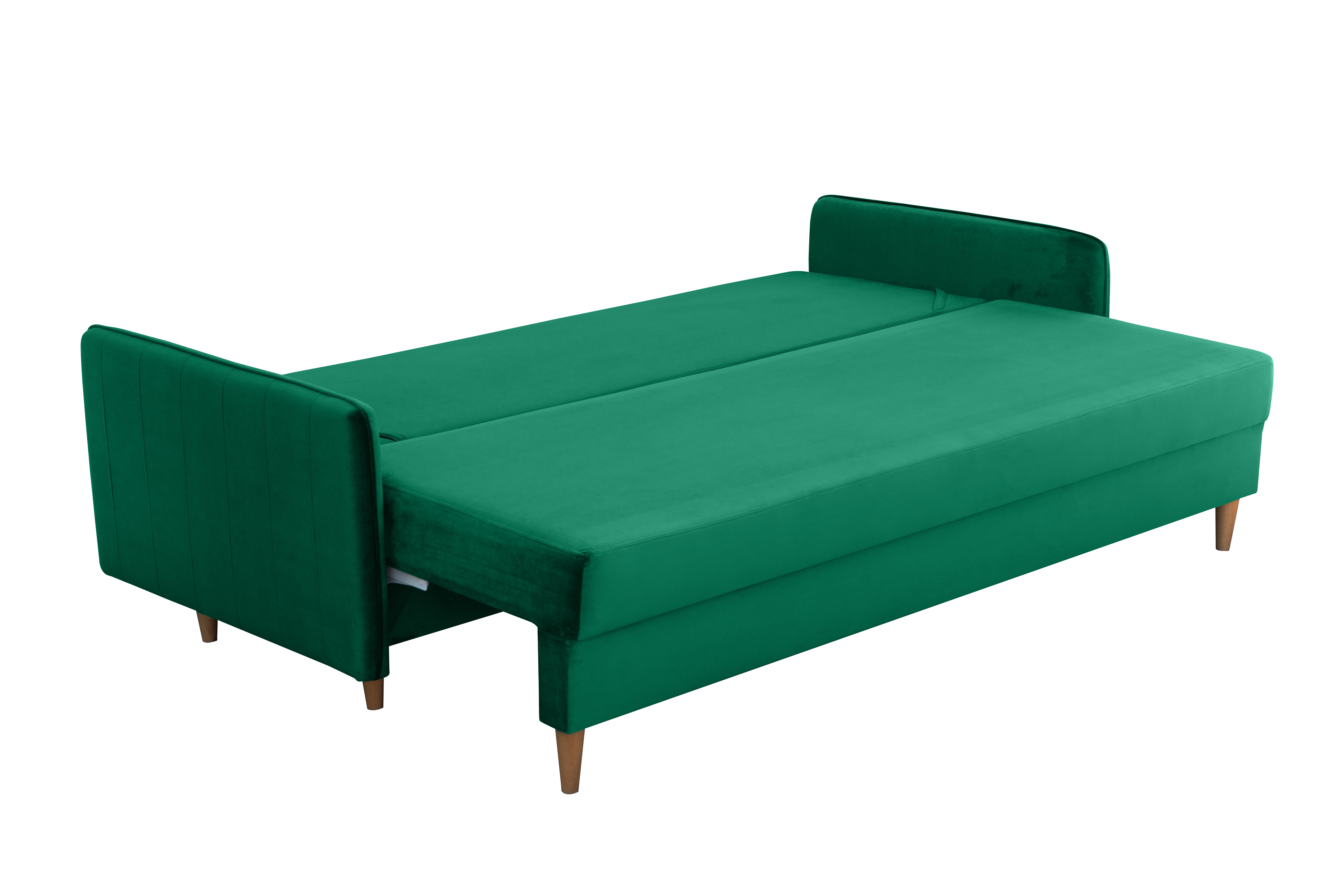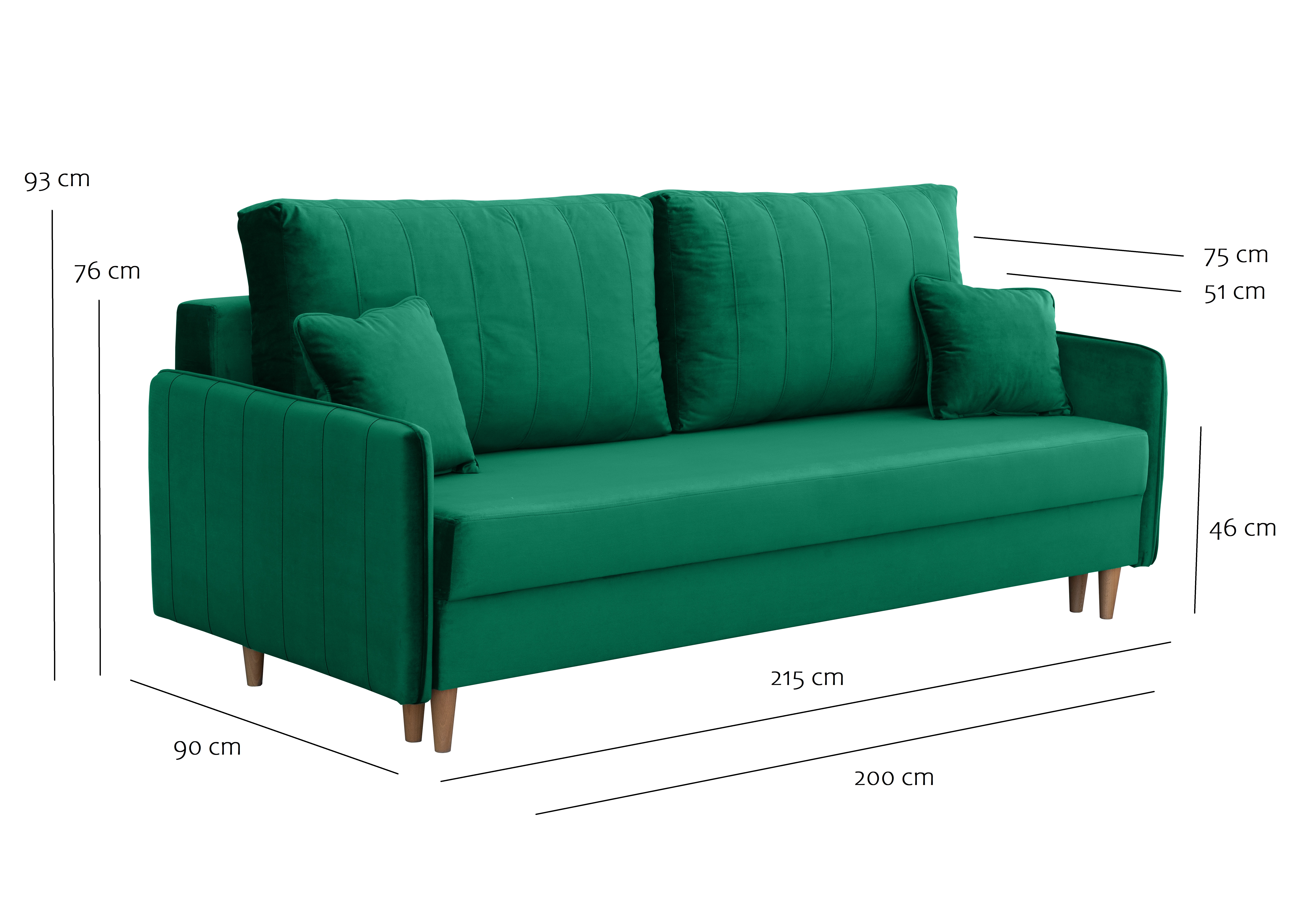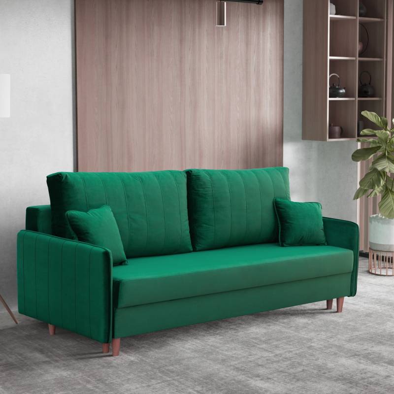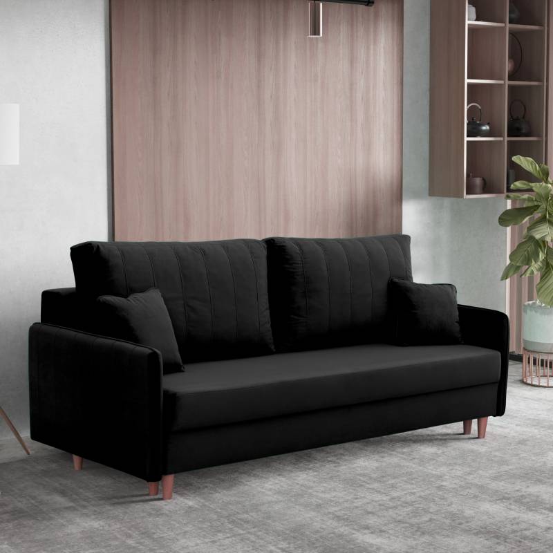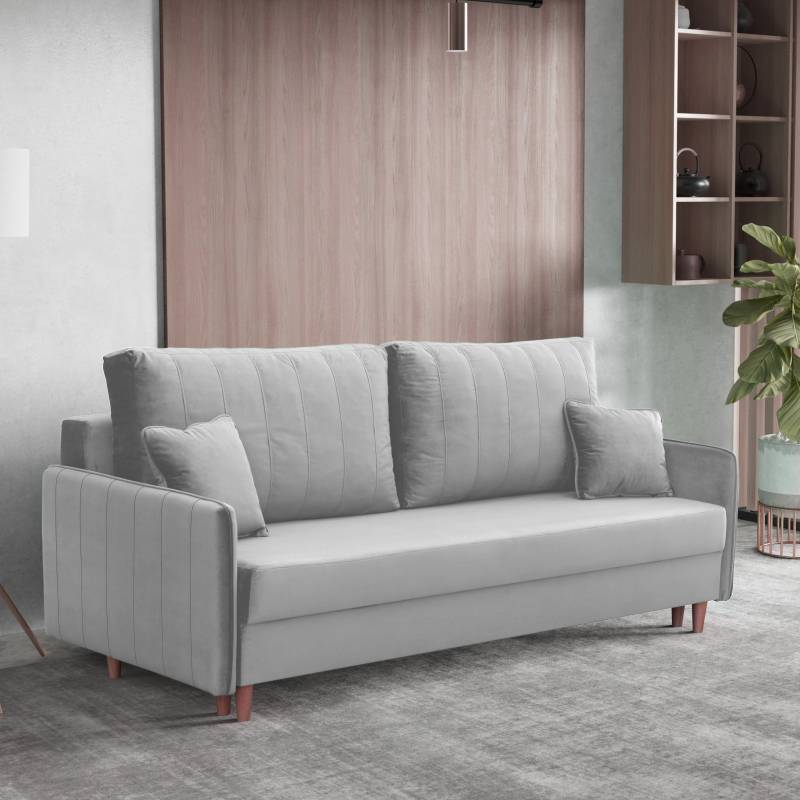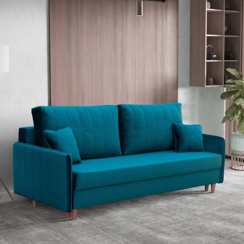 Obita wysokiej jakości tkaniną Magic Velvet, cechuje się przyjemnym w dotyku welurowym materiałem, odpornością na ścieranie i luksusowym wyglądem. Wysokie drewniane nóżki dodają lekkości i ułatwiają sprzątanie, a wbudowany pojemnik na pościel oraz funkcja spania czynią ją idealnym wyborem zarówno do codziennego użytku, jak i dla gości.