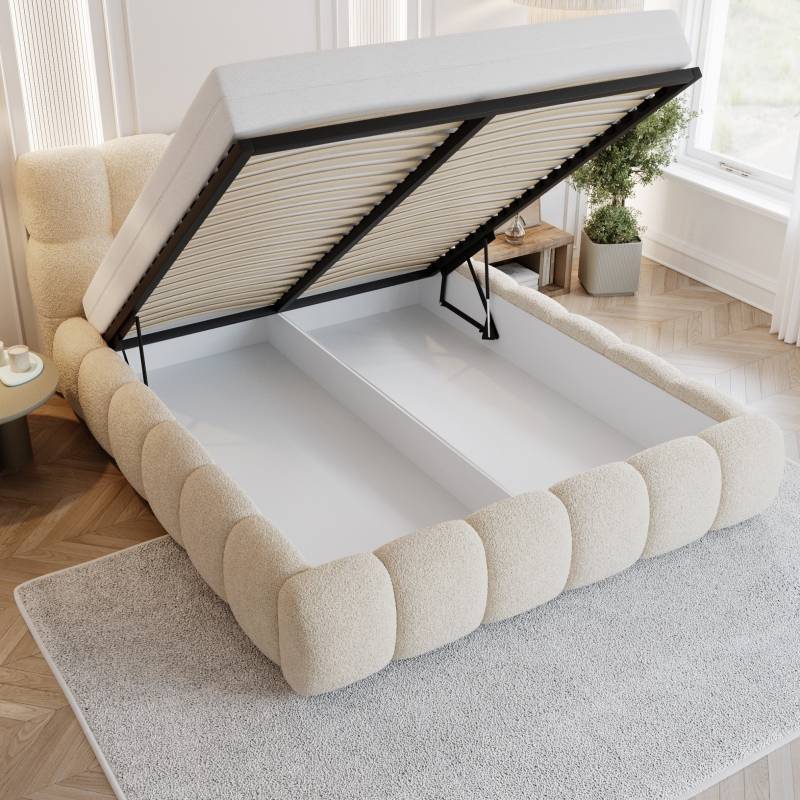 Pod powierzchnią spania kryje się obszerny pojemnik na pościel, który z łatwością pomieści kołdry, poduszki i inne akcesoria – idealne rozwiązanie dla osób ceniących funkcjonalność. Dzięki imponującemu rozmiarowi 200×200 cm, łóżko Teddy oferuje prawdziwy komfort królewskiego wypoczynku.