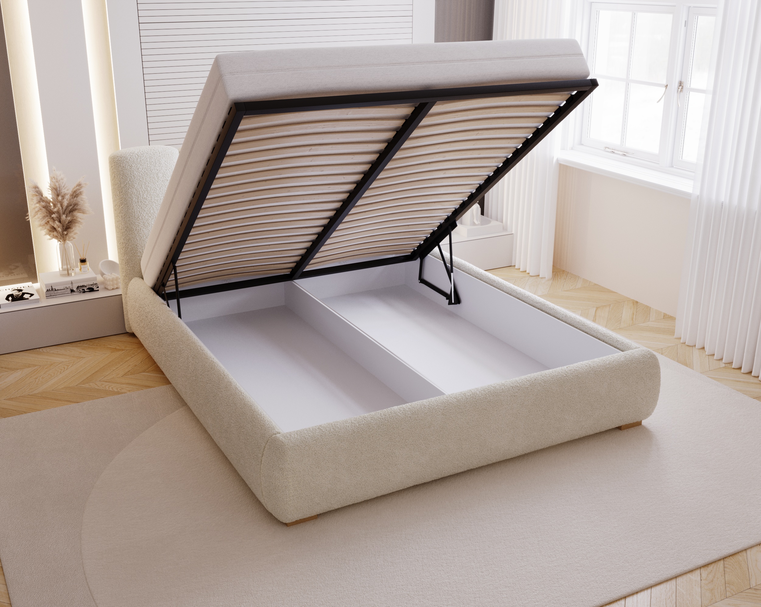Dzięki zastosowaniu podnośników gazowych otwieranie łóżka jest lekkie i bezpieczne. Mechanizm działa płynnie, co znacząco zwiększa komfort codziennego użytkowania.