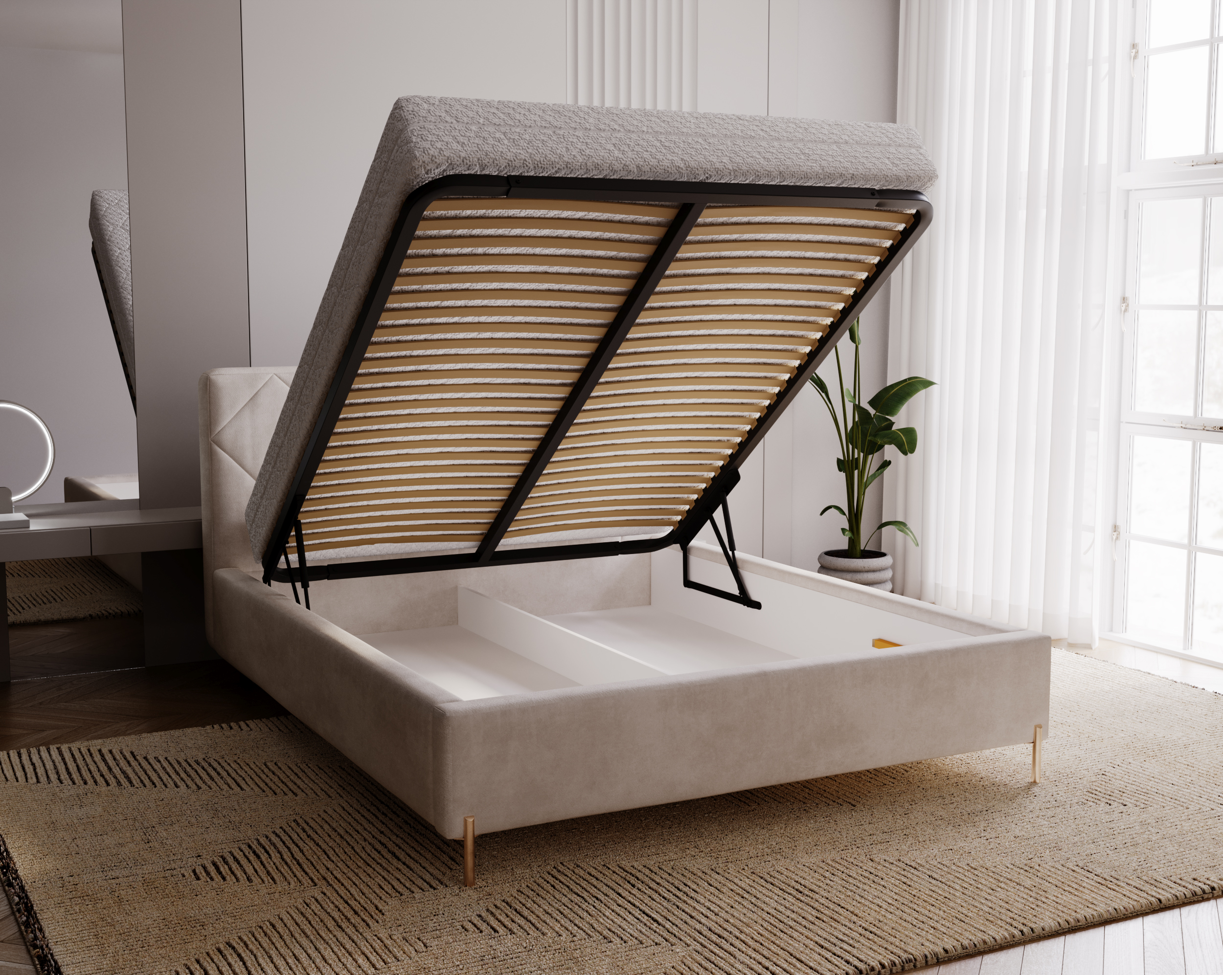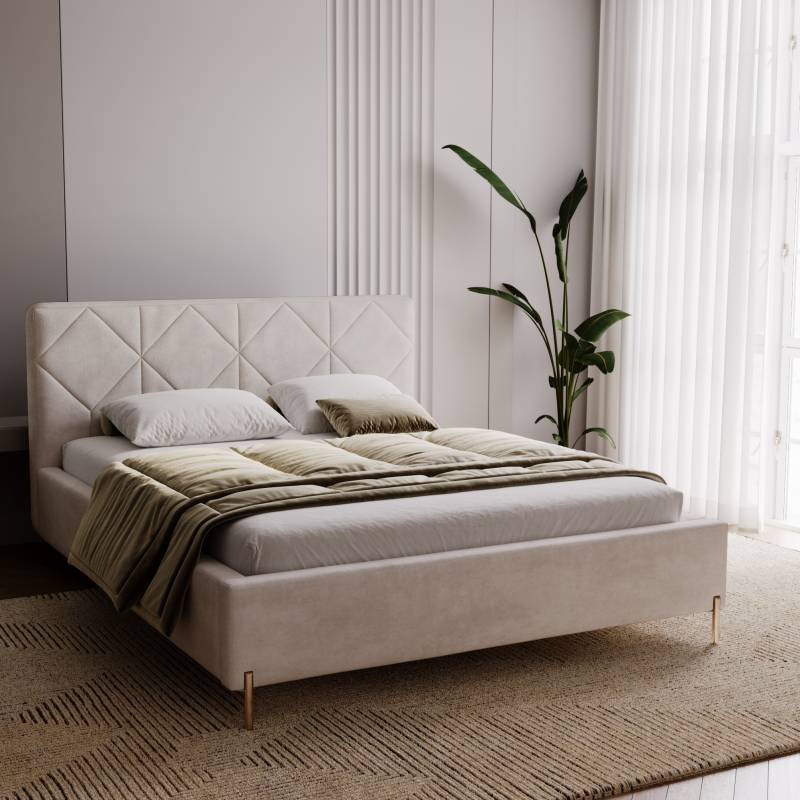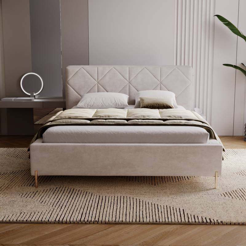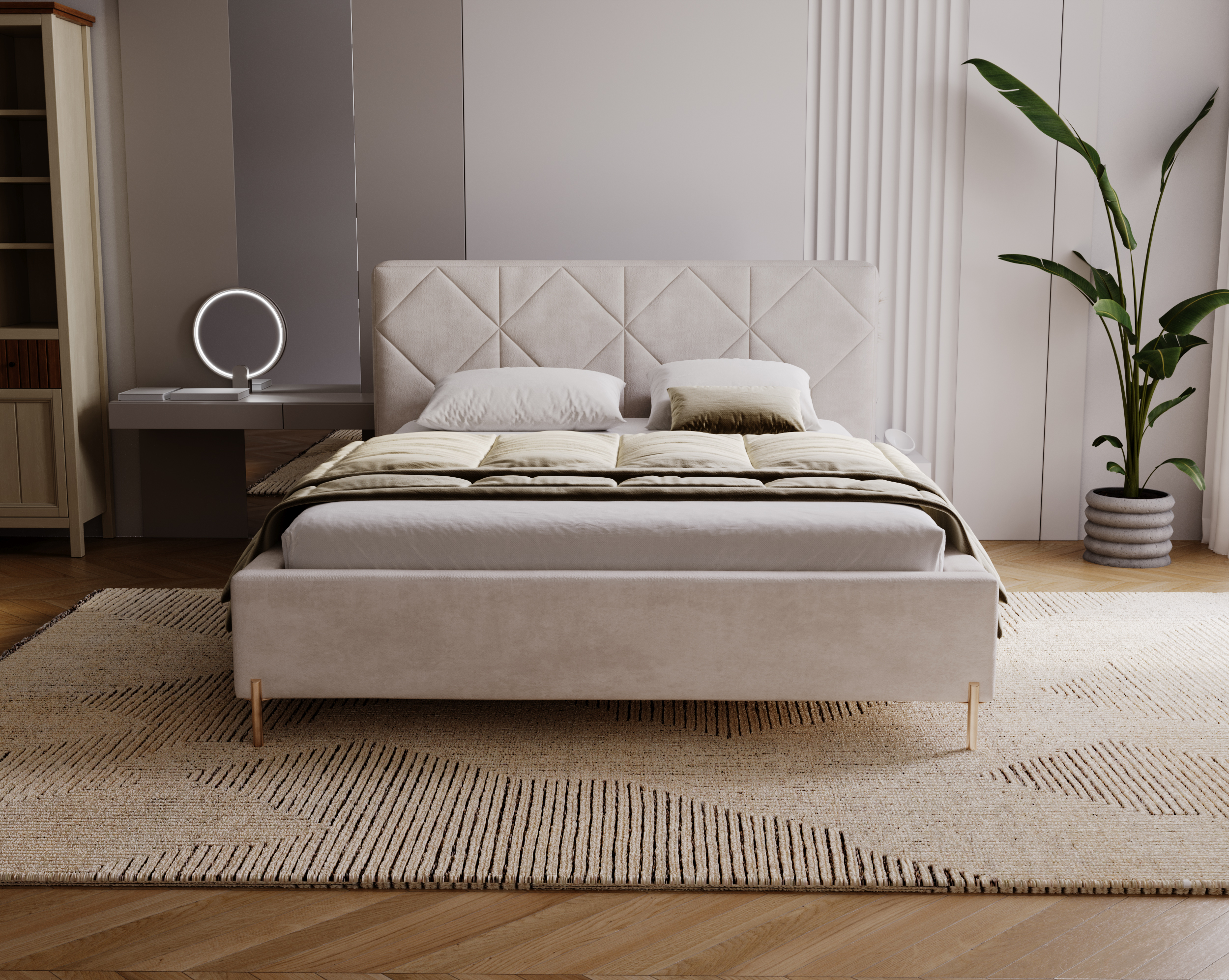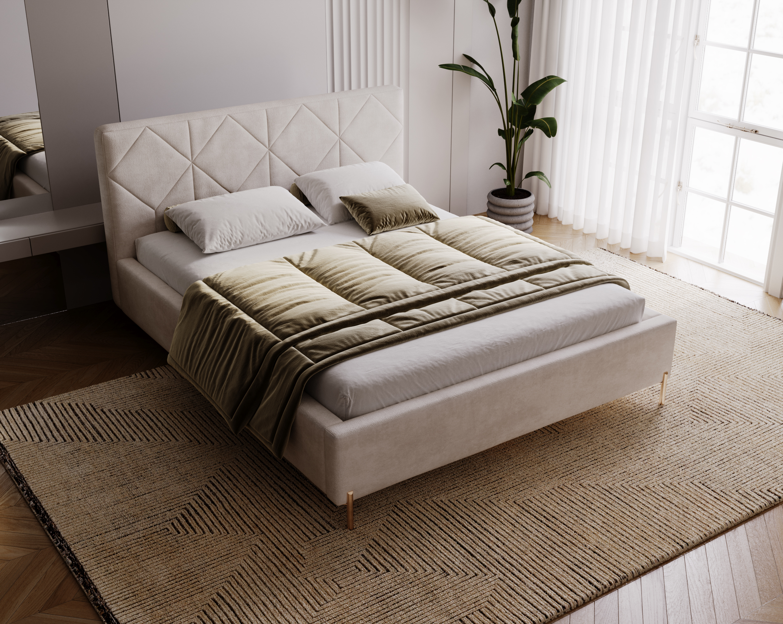 Łóżko tapicerowane Loren 160x200 cm to stylowa i funkcjonalna propozycja do nowoczesnej sypialni. Jasna, miękka tapicerka w połączeniu z geometrycznie pikowanym zagłówkiem tworzy elegancki, ponadczasowy design, który doskonale wpisuje się w trendy wnętrzarskie. Model Loren łączy komfort codziennego użytkowania z solidnym wykonaniem i estetyką klasy premium.