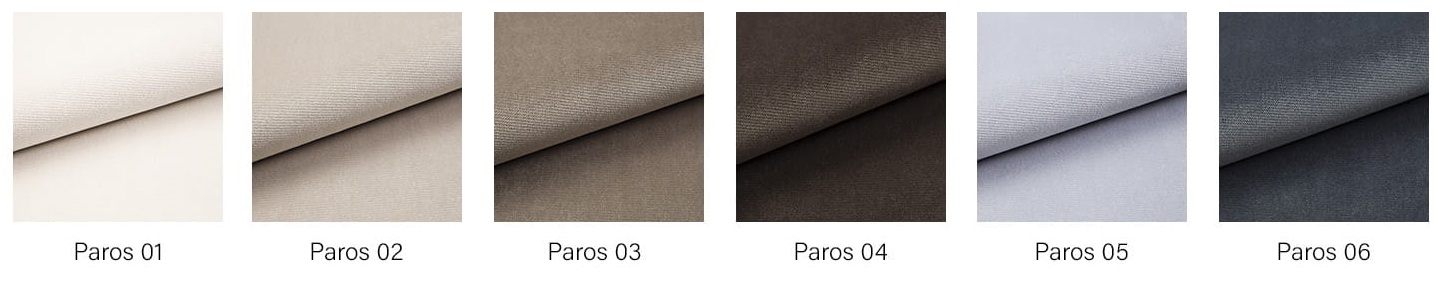 Tkanina Paros to wysokiej jakości materiał o pluszowej, delikatnie włoskowatej strukturze, zapewniający elegancki efekt cieniowania zmieniający się pod wpływem dotyku i ułożenia włókien. Nadaje meblom szlachetny, nowoczesny wygląd, podkreślając ich formę. Charakteryzuje się podwyższoną odpornością na ścieranie oraz trwałością, dzięki czemu sprawdza się zarówno w przestrzeniach mieszkalnych, jak i intensywnie użytkowanych wnętrzach.