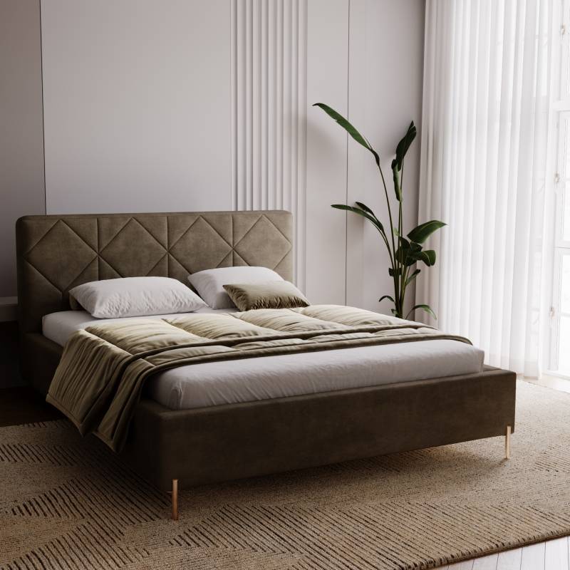 Wysokie, tapicerowane wezgłowie z dekoracyjnymi przeszyciami w formie geometrycznych paneli nie tylko przyciąga wzrok, ale również zapewnia wygodne oparcie podczas czytania książki czy oglądania telewizji. To idealne rozwiązanie dla osób, które cenią komfort i elegancję w jednym.